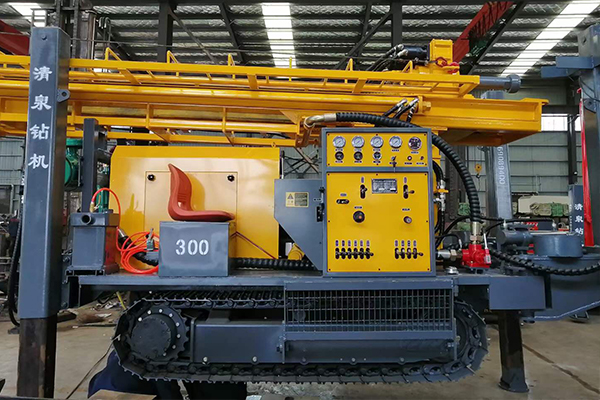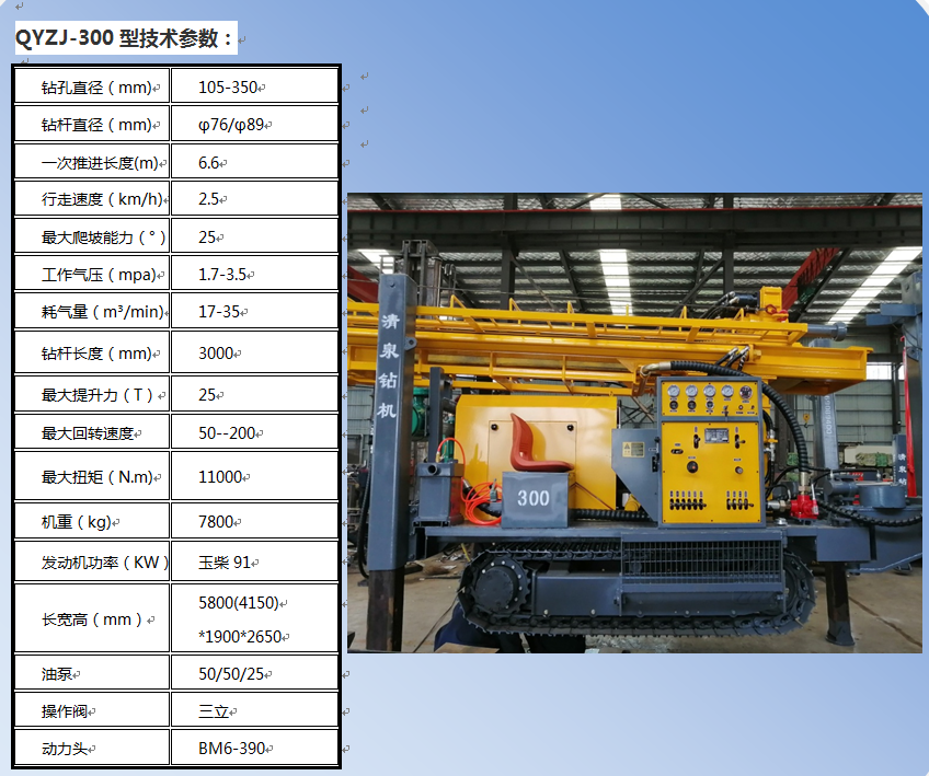 清泉300型潛孔水井鉆機 發動機功率:玉柴92千瓦。 油泵:美國泊姆克三聯泵 動力頭馬達: BM6-390。 最大扭矩: 11000扭米。 最大提升力: 25噸v 操作閥:三立。 整機機重: 7. 8噸。 尺寸:長5.8米(底長4.15米),寬1.85米,高2.35米。 鉆孔直徑: 105-350 毫米。 鉆桿直徑:φ76/φ89毫米(3米)。 一次性推進長度: 6600 毫米